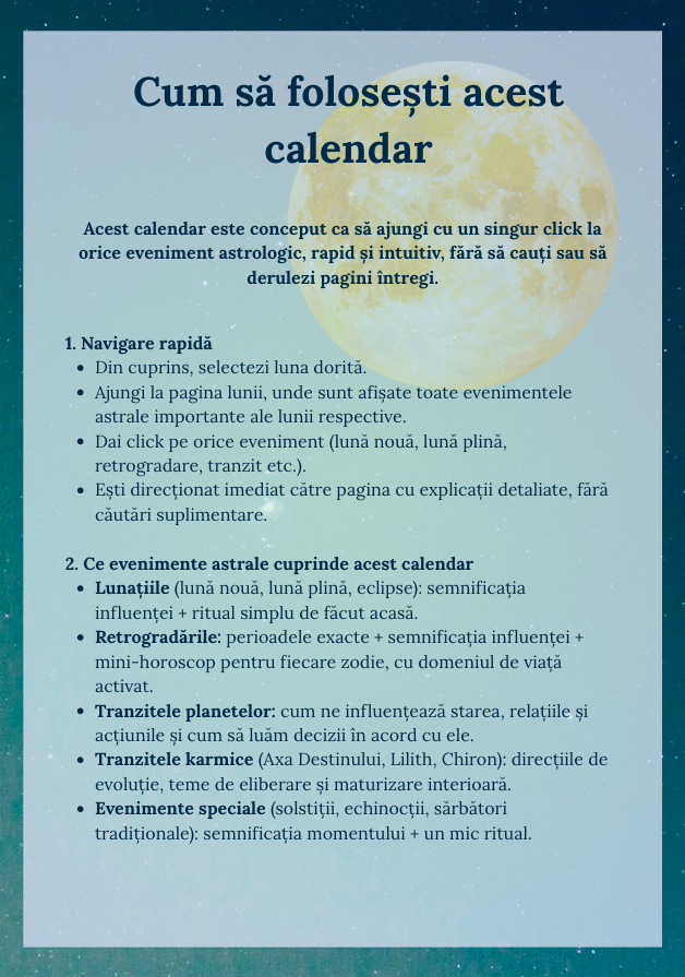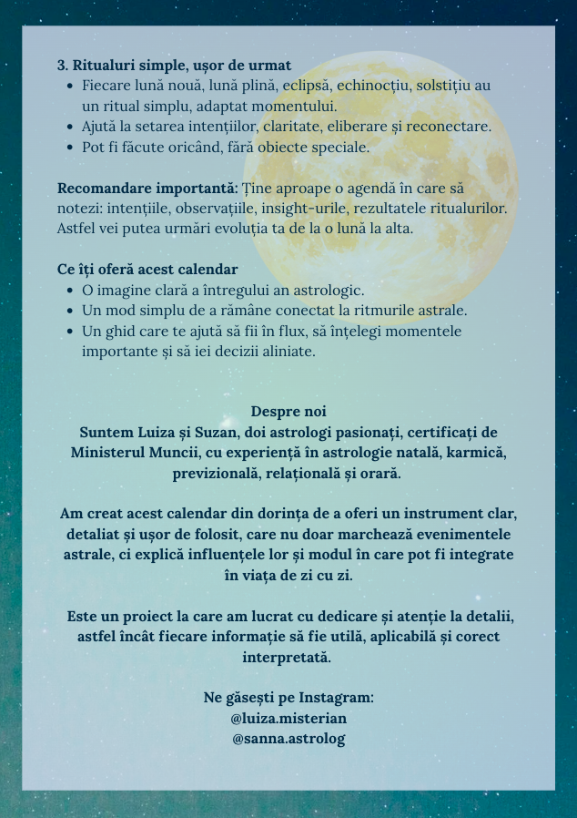 • Include toate evenimentele astrale importante ale anului 2026, explicate clar si aplicabil